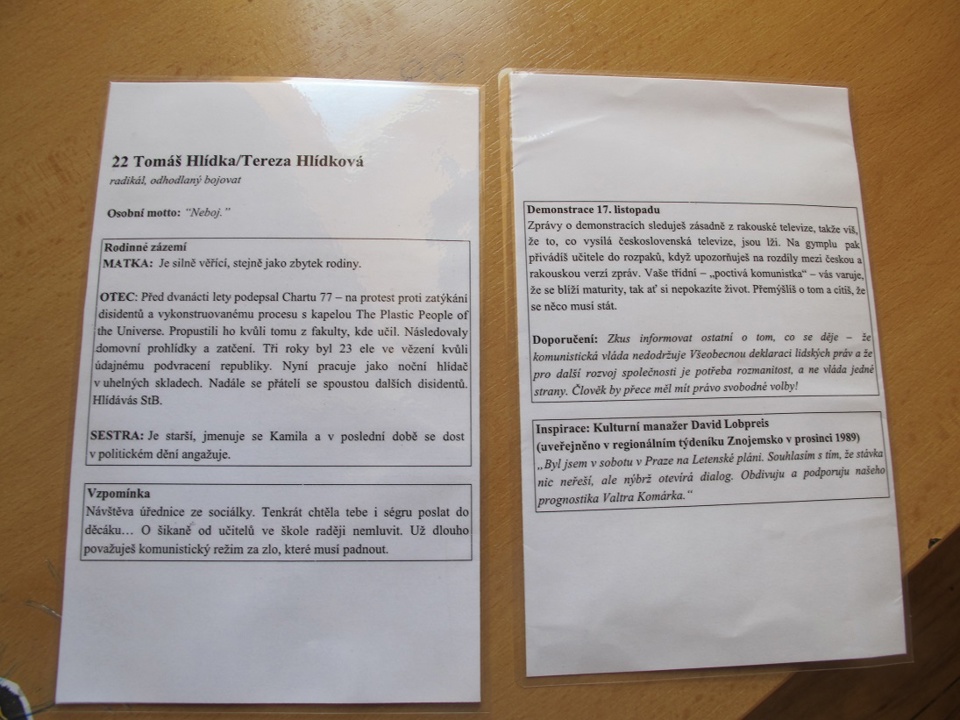 Zážitkový workshop na principu jednoduchého hraní rolí nabízí účastníkům pohled na události listopadu 1989 očima středoškolských studentů, kteří na své škole vyhlásí stávku coby vlastní příspěvek k prožívaným událostem. Každý z nich má jiné rodinné zázemí – někteří pocházejí z disidentského prostředí, jiní vnímají komunistický režim optikou státní propagandy a zbytek teprve teď zjišťuje, že když se o některých věcech doma nemluvilo, neznamená to, že na ně jejich rodiče neměli vlastní – odlišný názor.