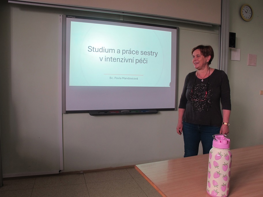 Bc. Pavla Mandovcová, z Oblastní nemocnice Příbram, naše nedávná maturantka, pohovořila obecně o studiu na zdravotní sestru, zmínila své zkušenosti, poradila zájemcům o lékařství či stejný obor, představila problematiku první pomoci i následné péče. Důležité téma, protože často může jít o život. Tak ať jsme připraveni a víme, jak na věc. Děkujeme!