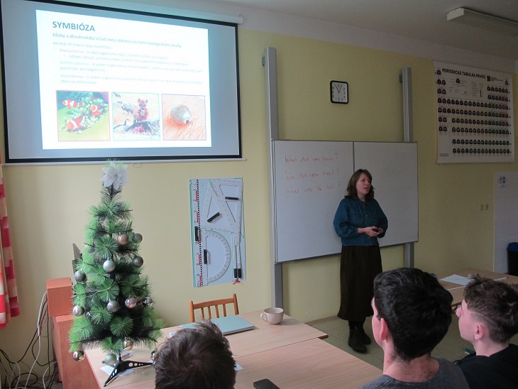 Přednášela naše bývalá studentka RNDr. Marie Jalovecká, Ph.D., z Přírodovědecké fakulty JČU České Budějovice. Přednáška pojednávala o symbiotických organismech, které pomáhají termitům a přežvýkavcům trávit celulózu a korálům „vylepšovat" jídelníček díky své fotosyntéze. Tedy: termiti a brvitky, přežvýkavci a bachořci, koráli a obrněnky. Děkujeme!!!